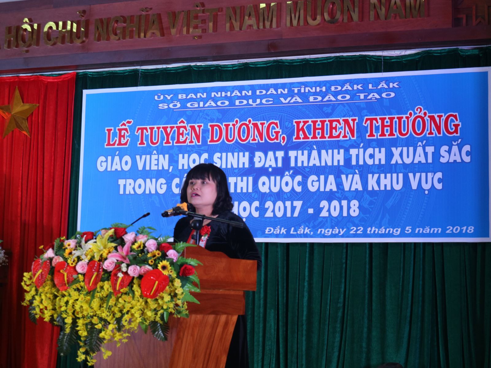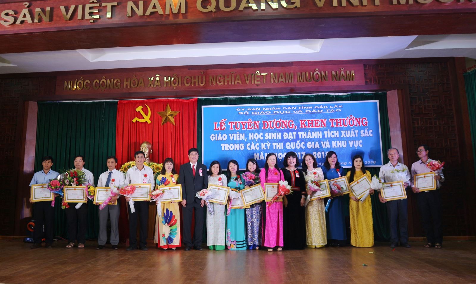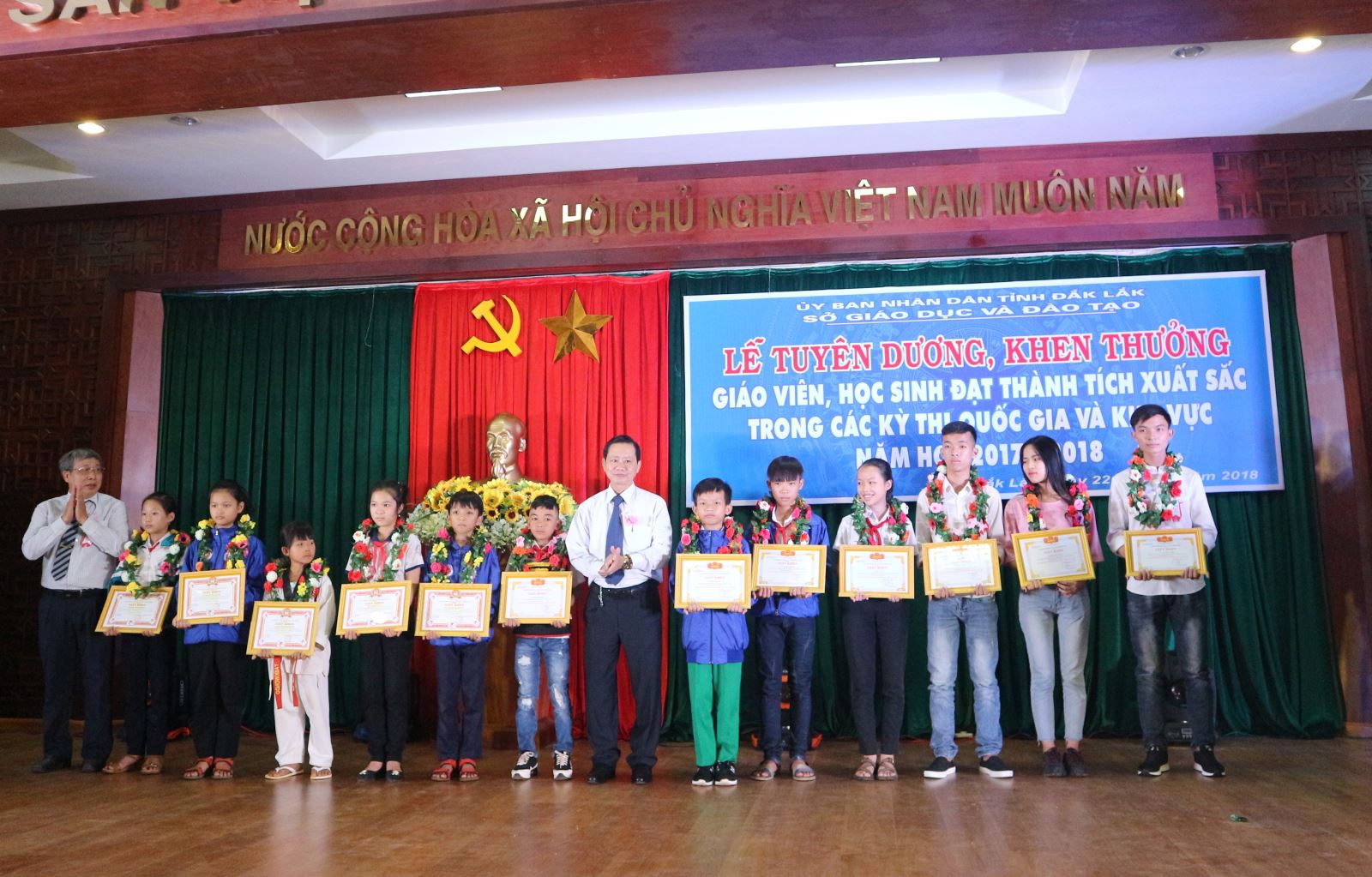 Sáng ngày 22/5/2018, UBND tỉnh long trọng tổ chức Lễ tuyên dương, khen thưởng giáo viên, học sinh đạt thành tích xuất sắc trong các kỳ thi quốc gia và khu vực năm 2017 - 2018. Phó Chủ tịch UBND tỉnh - H’Yim Kđoh tham dự buổi lễ và lãnh đạo các sở, ban, ngành, địa phương trên địa bàn tỉnh; các thầy cô giáo và các học sinh đạt giải.