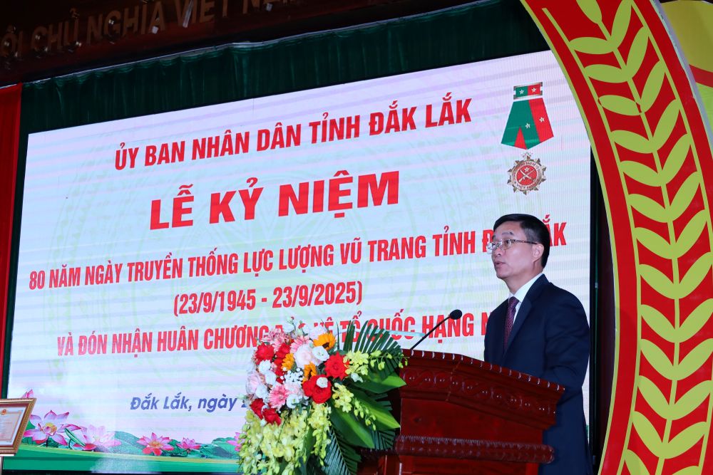 Chủ tịch UBND tỉnh Tạ Anh Tuấn đọc diễn văn kỷ niệm 80 năm xây dựng, chiến đấu, trưởng thành của lực lượng vũ trang tỉnh Đắk Lắk.