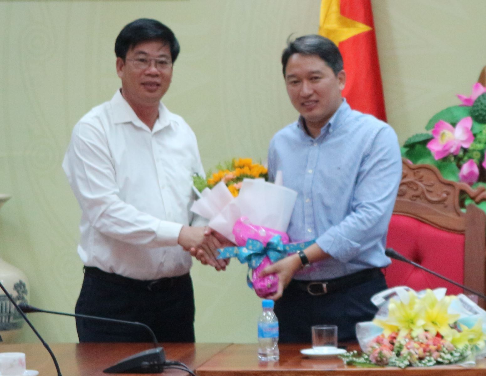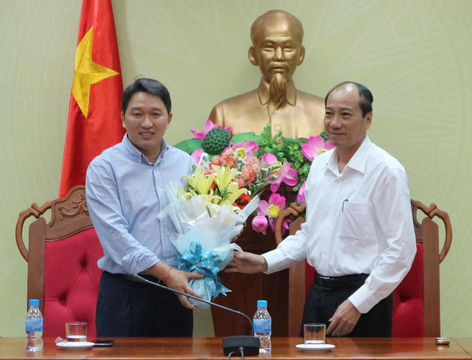 | Phó Chánh Văn phòng Trung ương Đảng Nguyễn Hải Ninh nhận hoa chúc mừng của Chánh Văn phòng UBND tỉnh Bùi Hồng Quý |