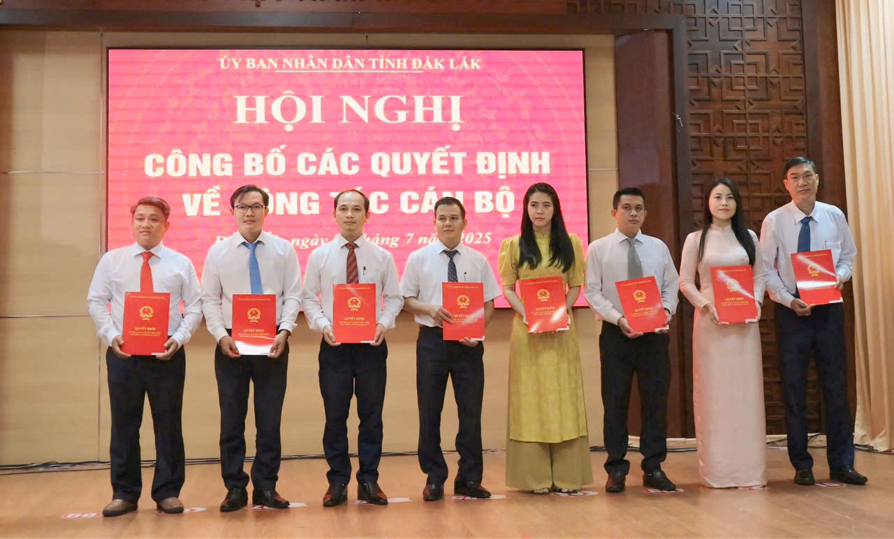 Chủ tịch UBND tỉnh bổ nhiệm Phó Chánh Văn phòng UBND tỉnh Đắk Lắk đối với ông Nguyễn Tiến Dũng, Phó Chánh Văn phòng UBND tỉnh Đắk Lắk (cũ), thời hạn bổ nhiệm kể từ ngày 02/7/2025 cho đến thời điểm đủ tuổi nghỉ hưu theo quy định; bổ nhiệm Phó Chánh Văn phòng UBND tỉnh Đắk Lắk thời hạn bổ nhiệm 05 năm, kể từ ngày 02/7/2025 đối với các ông/bà: Châu Thị Hồng Mai, Phó Chánh Văn phòng UBND tỉnh Đắk Lắk (cũ); ông Hoàng Trọng Hùng, Phó Chánh Văn phòng UBND tỉnh Đắk Lắk (cũ); bà Cao Như Khánh, Phó Chánh Văn phòng UBND tỉnh Đắk Lắk (cũ); ông Đoàn Ngọc Thượng, Phó Chánh Văn phòng UBND tỉnh Đắk Lắk (cũ).
