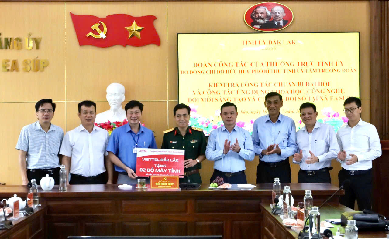 Đoàn công tác và đại diện lãnh đạo Viettel Đắk Lắk trao tặng 02 bộ máy tính cho xã Ea Súp.
