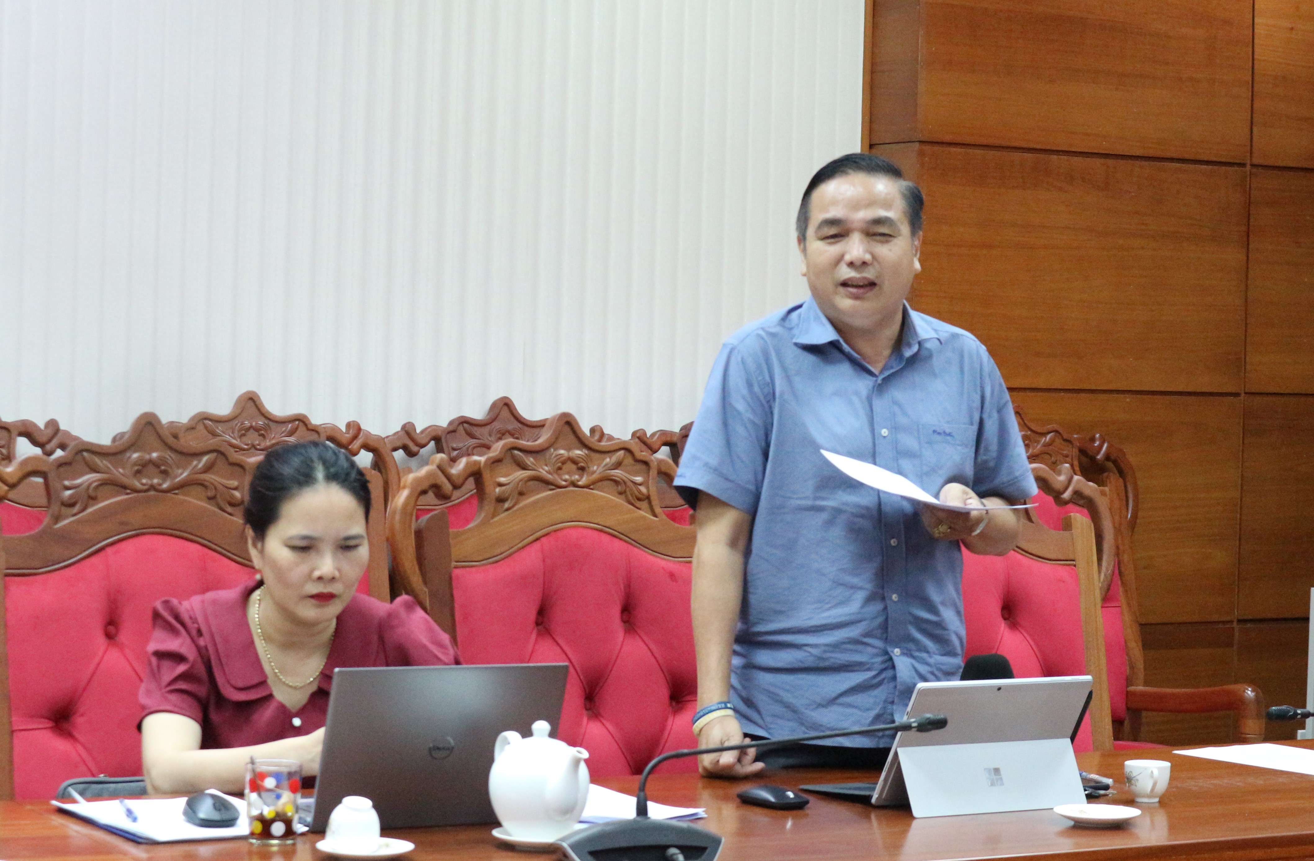 | Phó Chánh Văn phòng UBND tỉnh Lê Thị Thanh Thủy tham gia ý kiến tại cuộc họp |