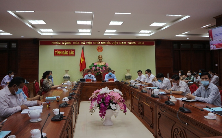 | Phó Bí thư Tỉnh ủy Y Biêr Niê; Phó Chủ tịch Thường trực UBND tỉnh Nguyễn Tuấn Hà cùng lãnh đạo các sở, ngành tham dự tại điểm cầu tỉnh Đắk Lắk |