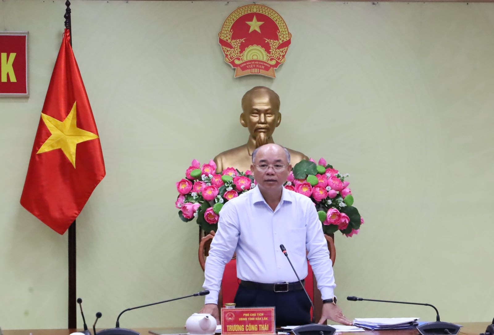 | Phó Chủ tịch UBND tỉnh Trương Công Thái phát biểu tại cuộc họp. |