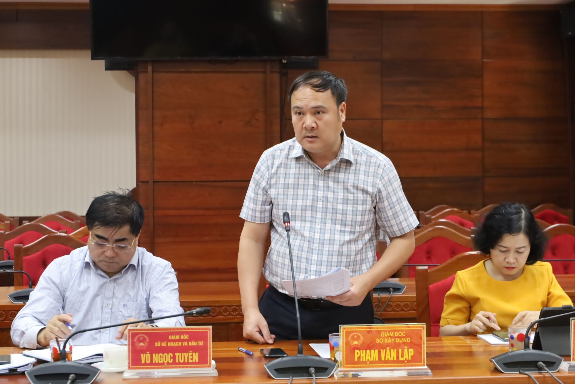 | Giám đốc Sở Xây dựng Phạm Văn Lập trình bày dự thảo Quyết định tại phiên họp. |
