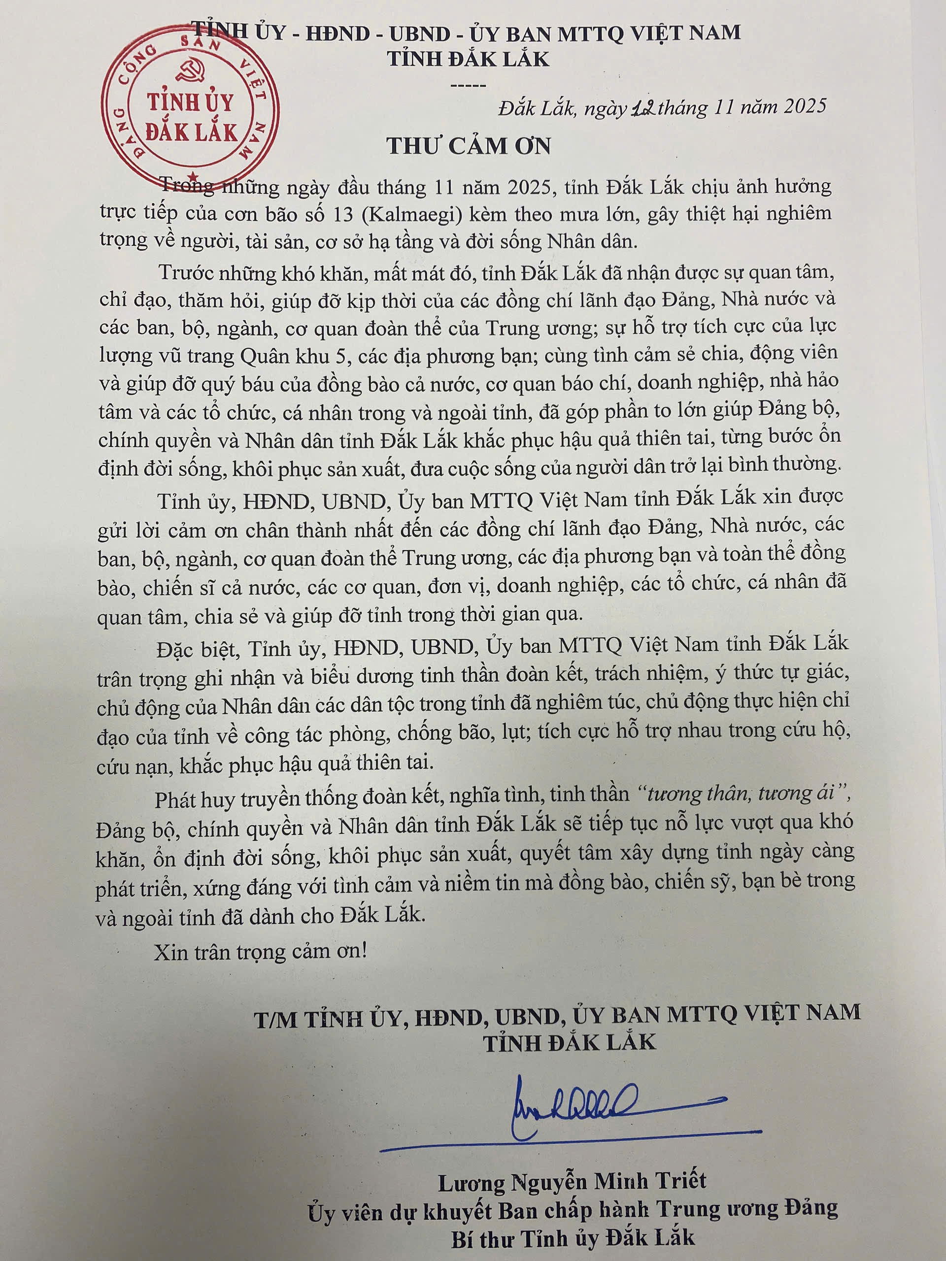 Tỉnh ủy - HĐND - UBND - Ủy ban MTTQ Việt Nam tỉnh Đắk Lắk vừa có Thư cảm ơn nhằm gửi lời cảm ơn chân thành nhất đến các đồng chí lãnh đạo Đảng, Nhà nước, các ban, bộ, ngành, cơ quan, đoàn thể Trung ương, các địa phương bạn và toàn thể đồng bào, chiến sĩ cả nước, các cơ quan, đơn vị, doanh nghiệp, các tổ chức, cá nhân đã kịp thời quan tâm, chia sẻ trước những khó khăn, mất mát do cơn bão số 13 gây ra trên địa bàn, cũng như động viên, giúp đỡ tỉnh Đắk Lắk khắc phục hậu quả thiên tai, từng bước ổn định đời sống, khôi phục sản xuất, đưa cuộc sống của người dân trở lại bình thường.