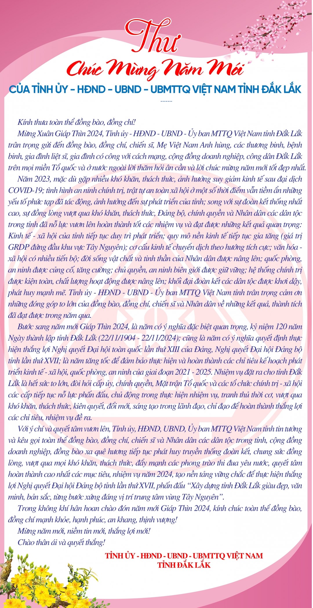 Thư Chúc mừng năm mới của Tỉnh ủy - HĐND - UBND - Ủy ban MTTQ Việt Nam tỉnh Đắk Lắk