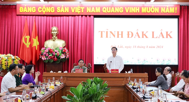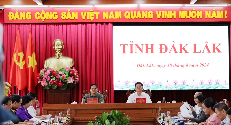 Chiều 18/8, trong khuôn khổ chuyến công tác tại tỉnh Đắk Lắk, Đoàn công tác của Thủ tướng Chính phủ Phạm Minh Chính đã có buổi làm việc với Ban Thường vụ Tỉnh ủy Đắk Lắk nhằm nghe báo cáo tình hình thực hiện nhiệm vụ chính trị 7 tháng đầu năm 2024, kết quả thực hiện Nghị quyết Đại hội Đảng bộ tỉnh lần thứ XVII, nhiệm kỳ 2020 - 2025 và phương hướng, nhiệm vụ trong thời gian tới.