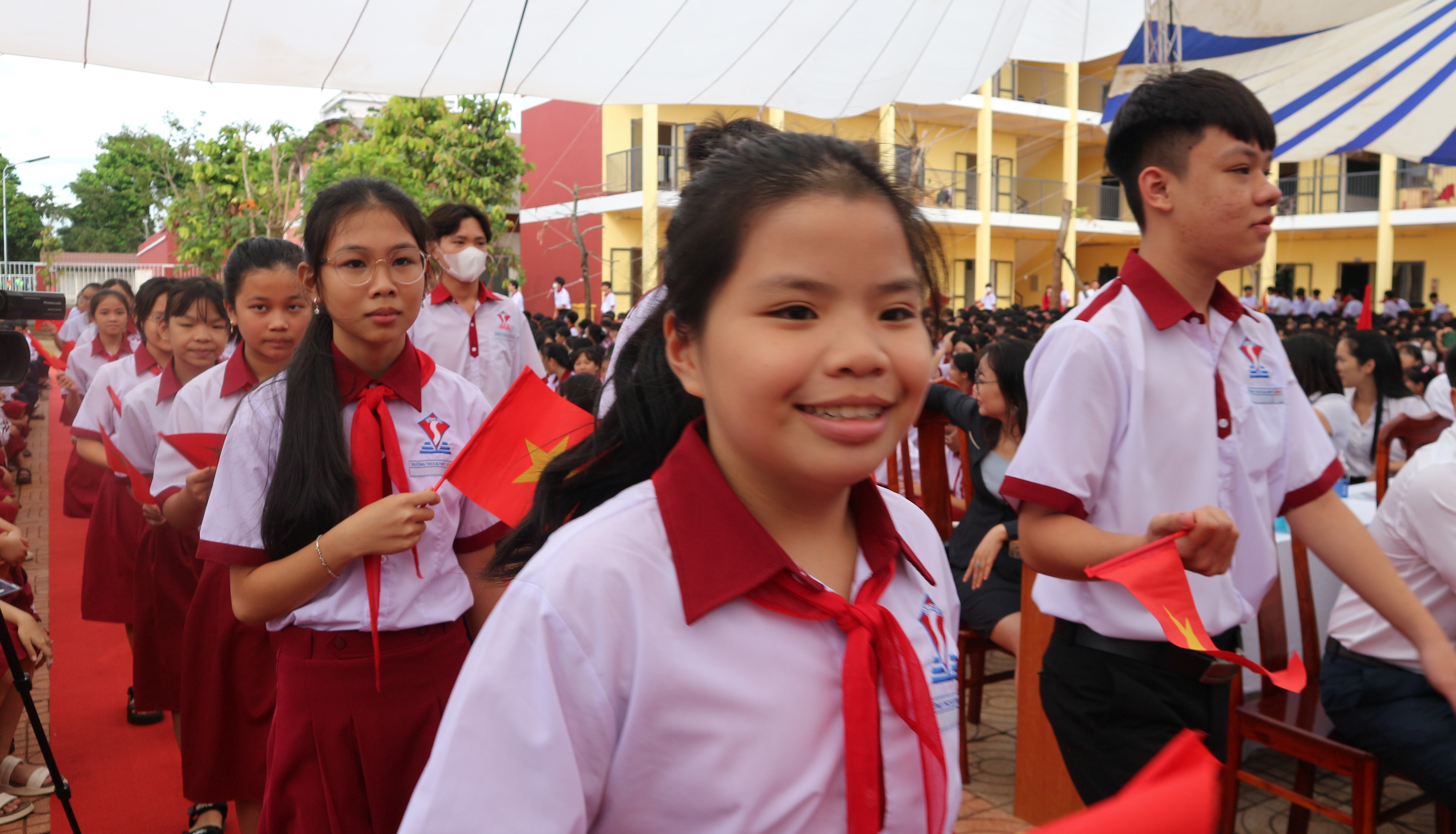 | Học sinh Trường THCS và THPT Đông Du hân hoan trong ngày khai giảng năm học 2023 - 2024 |