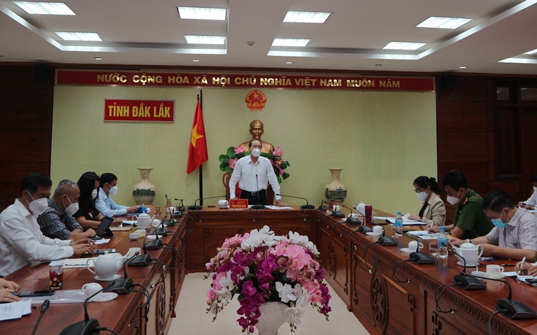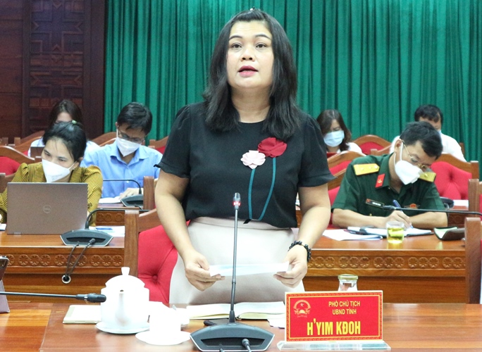 | Phó Chủ tịch UBND tỉnh, Phó Trưởng Ban Chỉ đạo phòng chống dịch COVID-19 tỉnh H’Yim Kđoh báo cáo tình hình công dân về tỉnh tại cuộc họp |