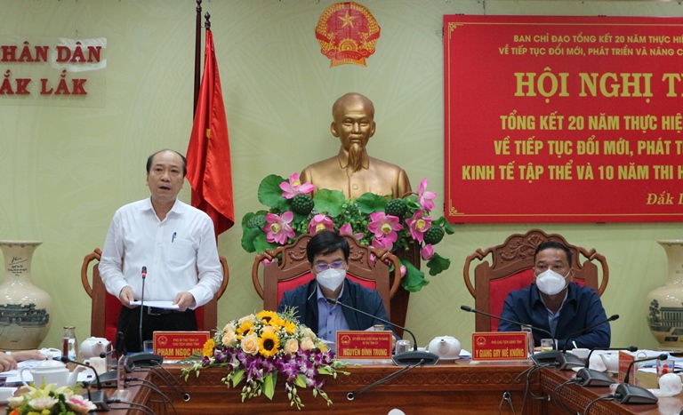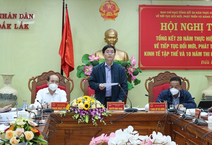 Sáng 30/12, Ban Chỉ đạo Tổng kết 20 năm thực hiện Nghị quyết Trung ương 5 khóa IX, về tiếp tục đổi mới, phát triển và nâng cao hiệu quả kinh tế tập thể (KTTT) tỉnh Đắk Lắk tổ chức Hội nghị trực tuyến nhằm tổng kết 20 năm thực hiện Nghị quyết số 13-NQ/TW, ngày 18/3/2002 của Ban Chấp hành Trung ương Đảng khoá IX về tiếp tục đổi mới, phát triển và nâng cao hiệu quả KTTT, 10 năm thi hành Luật Hợp tác xã (HTX) năm 2012 trên địa bàn tỉnh. Đồng chí Ủy viên Trung ương Đảng, Bí thư Tỉnh ủy Nguyễn Đình Trung; Phó Bí thư Tỉnh ủy, Chủ tịch UBND tỉnh Phạm Ngọc Nghị; Phó Chủ tịch UBND tỉnh Y Giang Gry Niê Knơng tham dự và đồng chủ trì hội nghị tại đầu cầu UBND tỉnh.