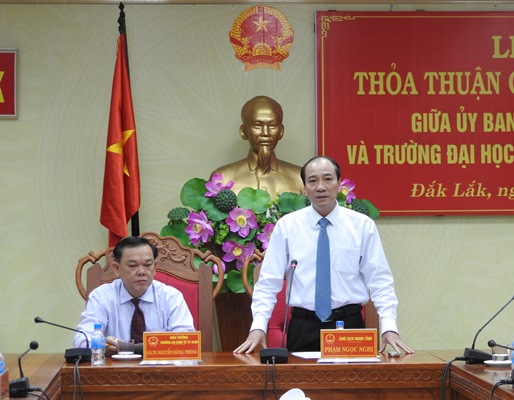 Chiều ngày 10/01/2018, tại trụ sở HĐND và UBND tỉnh đã diễn ra lễ ký thỏa thuận chương trình hợp tác giữa tỉnh Đắk Lắk với trường Đại học Kinh tế thành phố Hồ Chí Minh. Về phía tỉnh có ông Phạm Ngọc Nghị - Chủ tịch UBND tỉnh cùng đại diện lãnh đạo các sở, ban, ngành. Về phía trường có GS.TS Nguyễn Đông Phong - Hiệu trưởng trường Đại học Kinh tế thành phố Hồ Chí Minh cùng các thầy, cô giáo của Trường. Tại buổi lễ, hai bên đã cùng nhau thảo luận, góp ý và ký vào bản thỏa thuận chương trình hợp tác để làm cơ sở triển khai các hoạt động có liên quan trong 04 năm tới với các nội dung như sau: