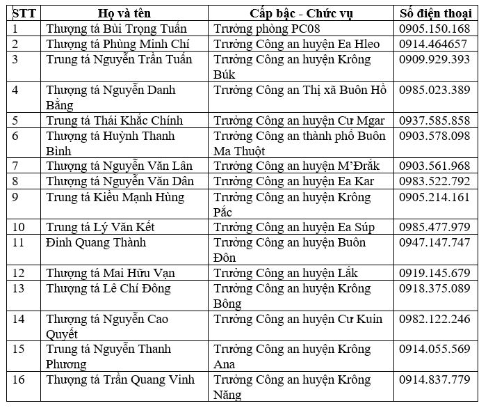 - Số điện thoại trực ban Công an tỉnh: 0694.389.111; số điện thoại đường dây nóng: 02623.704.444.