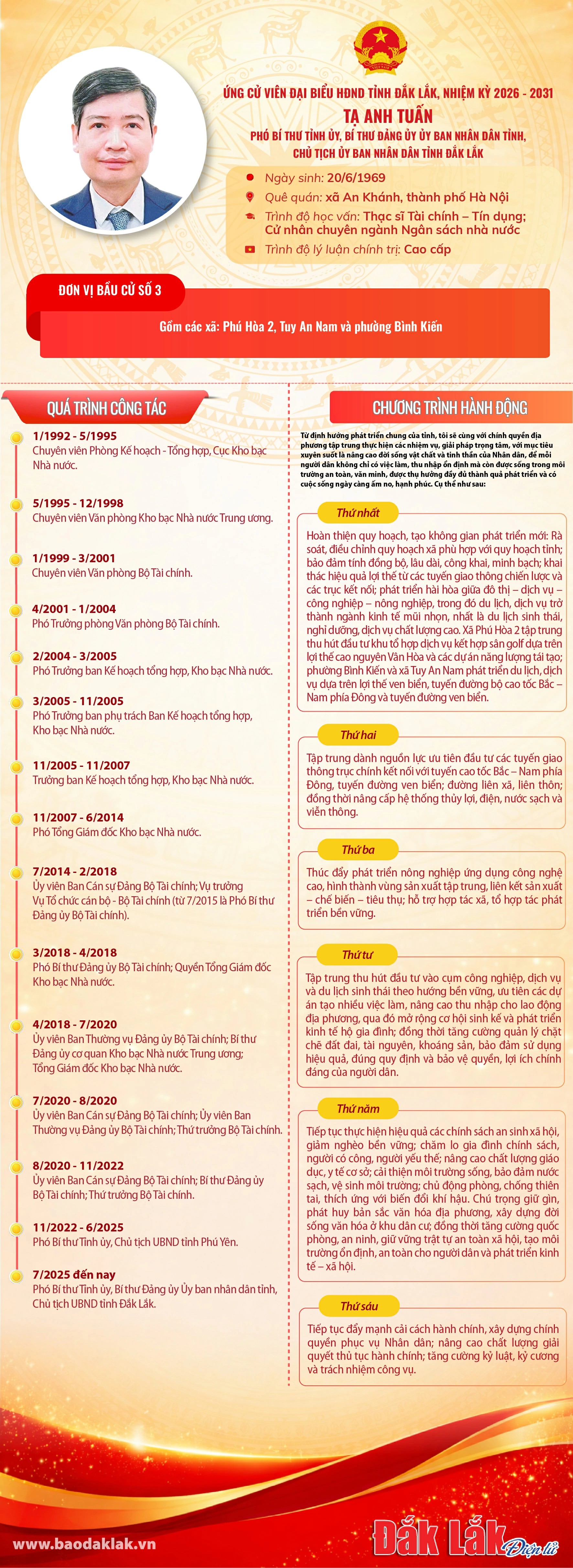 Tóm tắt Chương trình hành động của Chủ tịch UBND tỉnh Tạ Anh Tuấn ứng cử viên đại biểu HĐND tỉnh Đắk Lắk, nhiệm kỳ 2026-2031 - Đơn vị bầu cử số 3