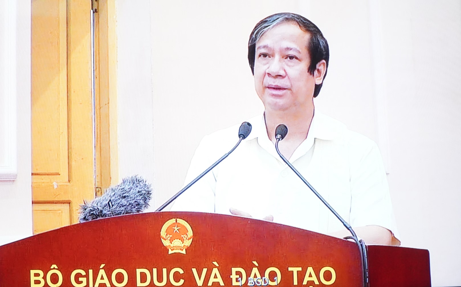 | Bộ trưởng Bộ Giáo dục và Đào tạo Nguyễn Kim Sơn phát biểu chị đạo tại hội nghị (ảnh chụp màn hình) |