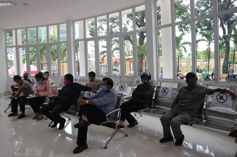 | Công dân ngồi đợi thực hiện thủ tục hành chính đảm bảo khoảng cách an toàn |