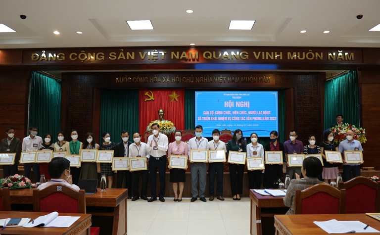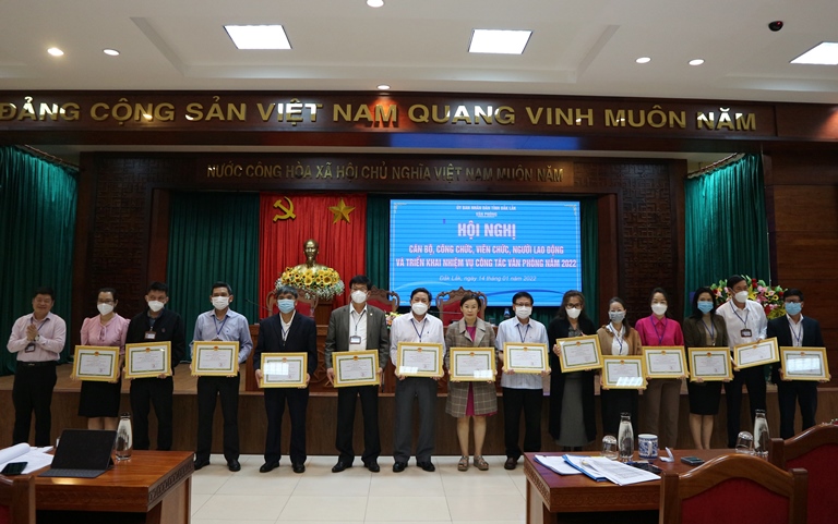 Nhân dịp này, Thủ tướng Chính phủ đã tặng Bằng khen cho 3 tập thể, 1 cá nhân của Văn phòng UBND tỉnh Đắk Lắk vì có thành tích xuất sắc trong công tác giai đoạn 2016 - 2020, góp phần vào sự nghiệp xây dựng chủ nghĩa xã hội và bảo vệ Tổ quốc; Chủ tịch UBND tỉnh tặng Bằng khen cho 3 tập thể, 27 cá nhân đã có thành tích hoàn thành xuất sắc nhiệm vụ năm 2021 và tặng Danh hiệu Tập thể lao động xuất sắc cho 9 tập thể thuộc Văn phòng UBND tỉnh; Chánh Văn phòng UBND tỉnh tặng Giấy khen cho 5 tập thể và 48 cá nhân có thành tích.