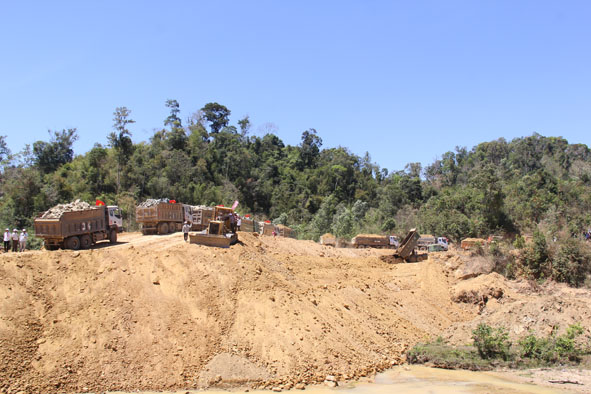 | Khu vực thi công lòng hồ xã Cư Yang (huyện Ea Kar) thuộc Dự án Hồ chứa nước Krông Pách Thượng huy động nhiều phương tiện phục vụ thi công (Ảnh: baodaklak.vn) |