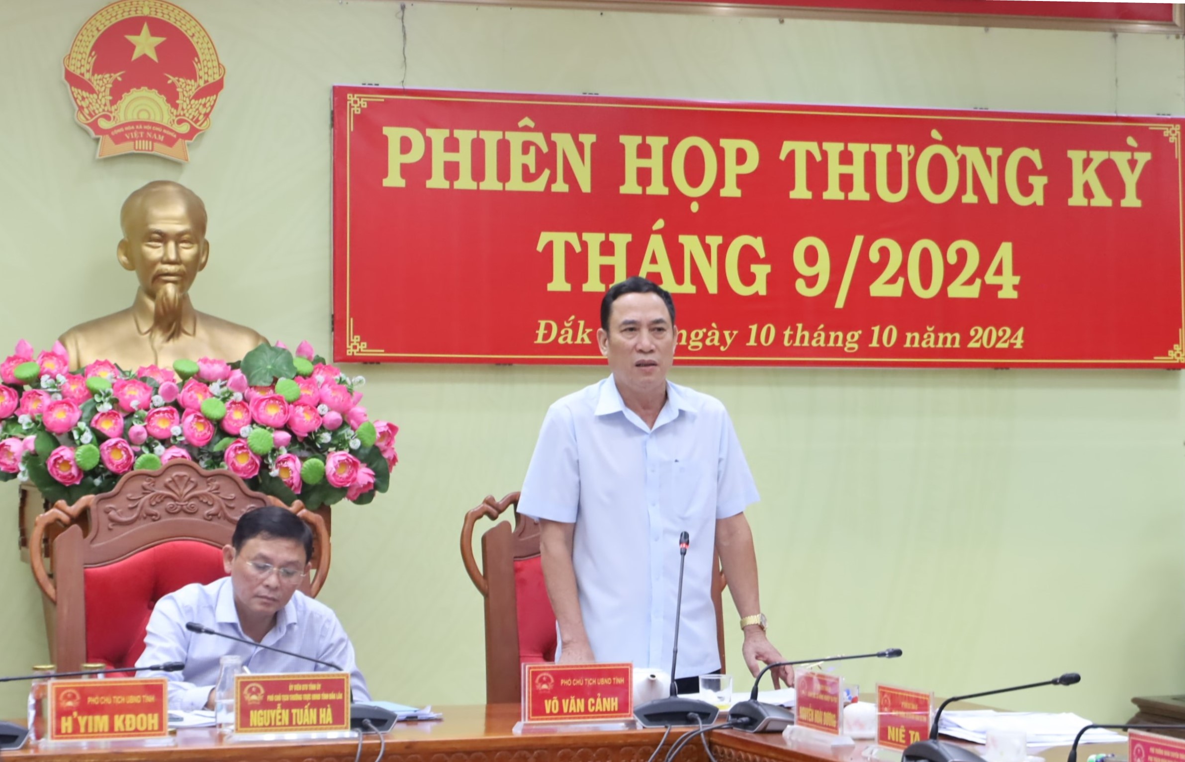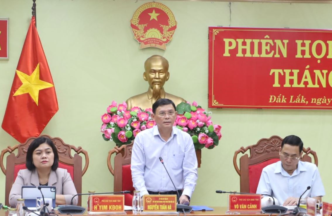 Ngày 10/10/2024, UBND tỉnh Đắk Lắk tổ chức phiên họp thường kỳ tháng 9 năm 2024 để đánh giá công tác chỉ đạo, điều hành của UBND tỉnh trong quá trình thực hiện các chỉ tiêu phát triển kinh tế - xã hội, đảm bảo quốc phòng - an ninh 9 tháng đầu năm, triển khai nhiệm vụ 03 tháng cuối năm 2024. Phiên họp được tổ chức trực tuyến với điểm cầu các huyện, thị xã, thành phố trong tỉnh. Các đồng chí: Nguyễn Tuấn Hà - Ủy viên Ban Thường vụ Tỉnh ủy, Phó Chủ tịch thường trực UBND tỉnh; Võ Văn Cảnh, H’Yim Kđoh Phó Chủ tịch UBND tỉnh đồng chủ trì phiên họp.