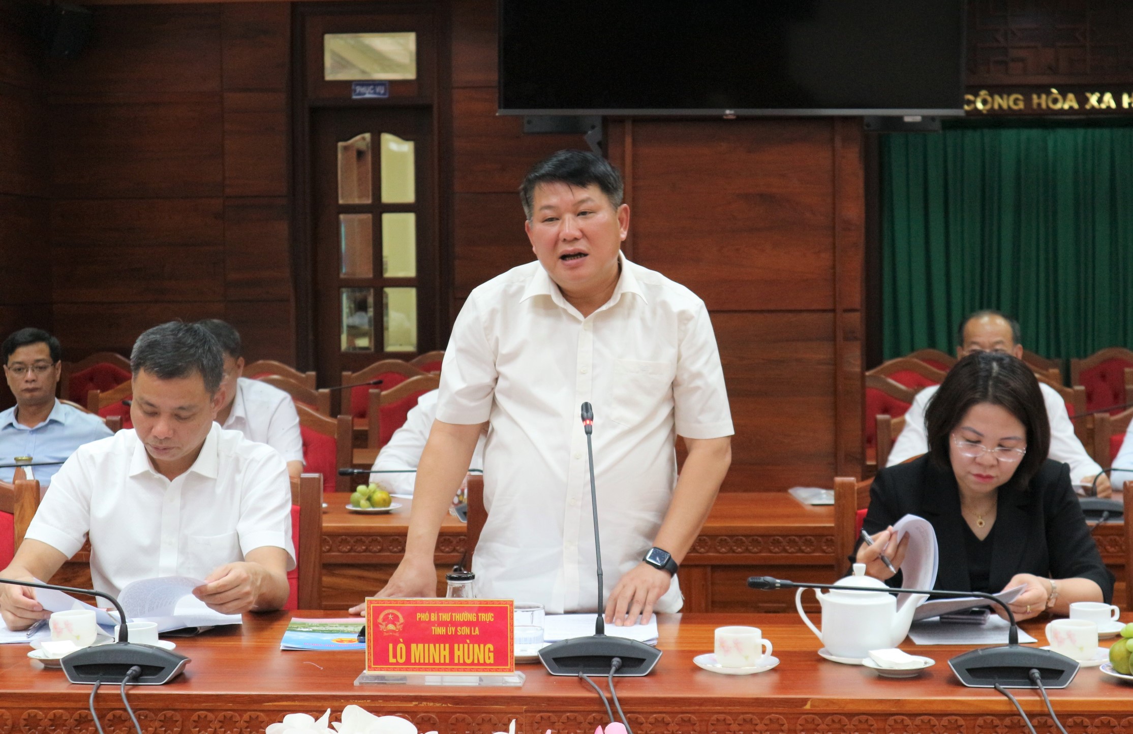 | Phó Bí thư Thường trực Tỉnh ủy tỉnh Sơn La Lò Minh Hùng phát biểu tại buổi làm việc |