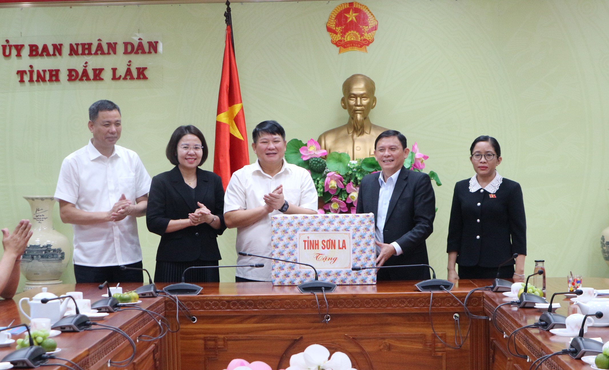 | Lãnh đạo tỉnh Đắk Lắk nhận quà lưu niệm của Đoàn Công tác tỉnh Sơn La |
