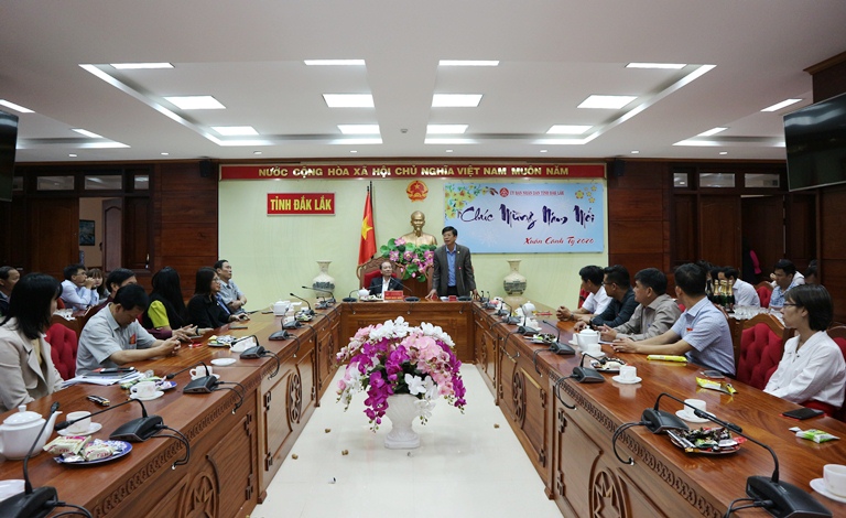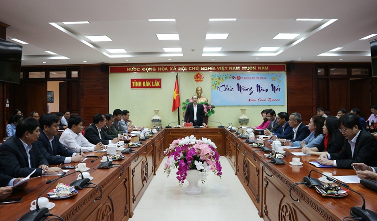 Phát biểu tại buổi gặp mặt, Chủ tịch UBND tỉnh Phạm Ngọc Nghị đã thay mặt lãnh đạo UBND tỉnh gửi lời chúc mừng năm mới đến lãnh đạo các cơ quan, đơn vị, đồng thời biểu dương những nỗ lực cố gắng của các cấp, các ngành để nhân dân đón Tết cổ truyền được ấm áp, an toàn và vui tươi, lành mạnh. Thời gian tới đồng chí đề nghị các ngành, các cấp bám sát chương trình của UBND tỉnh, của các đơn vị, địa phương để phát triển kinh tế theo kịch bản đã đề ra, trên cơ sở tái cơ cấu ngành nông nghiệp; tập trung tuyên truyền, thực hiện tốt Nghị định 100/2019/NĐ-CP ngày 30/12/2019 của Chính phủ về quy định xử phạt vi phạm hành chính trong lĩnh vực giao thông đường bộ và đường sắt. Đồng thời đề nghị ngành Y tế khẩn trương xây dựng phương án phòng, chống dịch bệnh viêm phối cấp di vi rút Corona gây ra; đồng ý cho UBND thành phố tổ chức hoạt động bắn pháo hoa và tổ chức văn nghệ nhân kỷ niệm 45 năm chiến thắng Buôn Ma Thuột và giải phóng tỉnh Đắk Lắk; lực lượng công an, bộ đội làm tốt công tác đảm bảo an ninh trật tự để người dân yên tâm sản xuất..