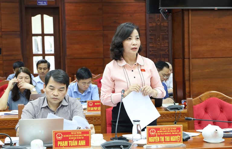 | Đại biểu Quốc hội Nguyễn Thị Thu Nguyệt, Bí thư Thị ủy Buôn Hồ phát biểu thảo luận tại buổi làm việc |