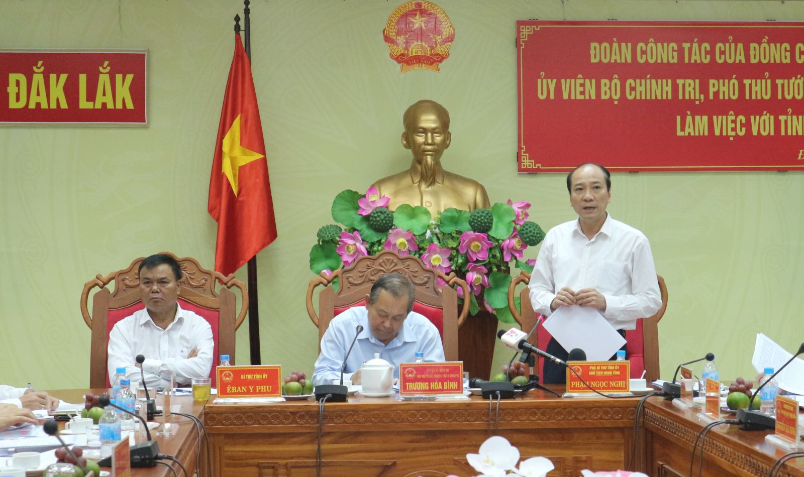 Phát biểu tại buổi làm việc, Chủ tịch UBND tỉnh - Phạm Ngọc Nghị đã giới thiệu khái quát về điều kiện tự nhiên và tình hình phát triển kinh tế - xã hội của địa phương. Địa phương xác định nông nghiệp là chủ đạo trong đó chú trọng tái canh cây cà phê và công nghiệp ưu tiên ứng dụng công nghệ cao, chế biến các sản phẩm nông nghiệp, công nghiệp cơ khí và năng lượng tái tạo (năng lượng mặt trời và năng lượng điện gió). Thương mại dịch vụ thì chú trọng vào du lịch sinh thái và phát triển du lịch xanh gắn với bảo tồn phát huy bản sắc văn hóa dân tộc. Việc dân di cư tự do cũng ảnh hưởng đến việc phát triển kinh tế - xã hội chung của tỉnh nhưng tỉnh đã thường xuyên quan tâm, chỉ đạo để người dân và các hộ gia đình ổn định với cuộc sống trên quê hương mới.