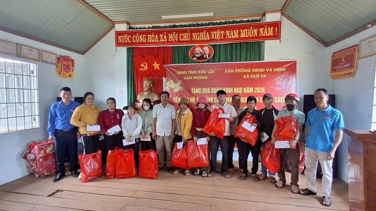Ngày 06/02, Đoàn công tác của Văn phòng UBND tỉnh Đắk Lắk đã đến thăm hỏi, chúc Tết và tặng quà các hộ gia đình cách mạng, gia đình chính sách tại buôn kết nghĩa Dliê Ya A, xã Dliê Ya, tỉnh Đắk Lắk nhân dịp Tết Nguyên đán Bính Ngọ năm 2026.
