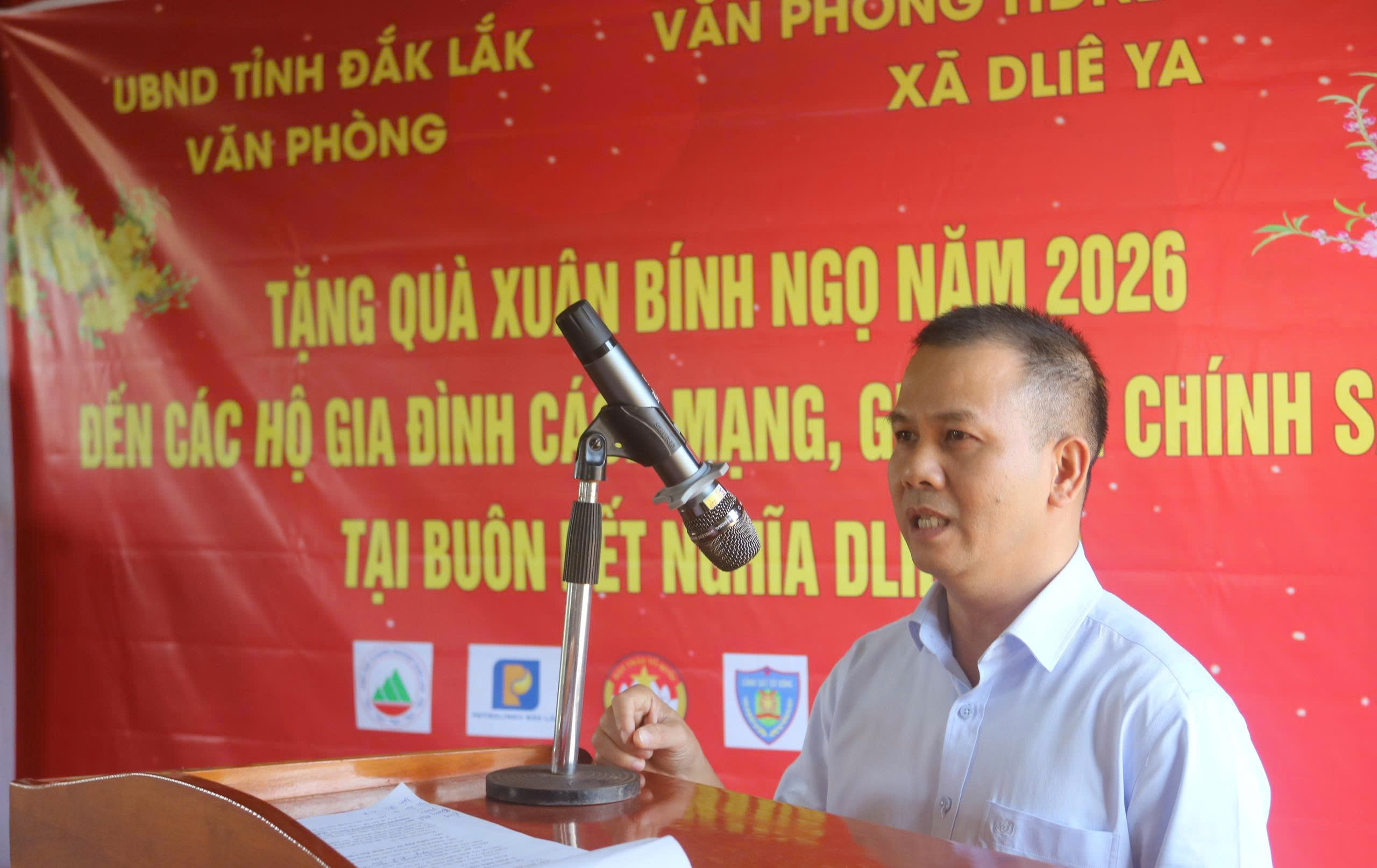 Phó Chánh Văn phòng UBND tỉnh Nguyễn Minh Hòa phát biểu thăm hỏi, chúc Tết và động viên Nhân dân buôn kết nghĩa Dliê Ya A nhân dịp Tết Nguyên đán Bính Ngọ 2026.
