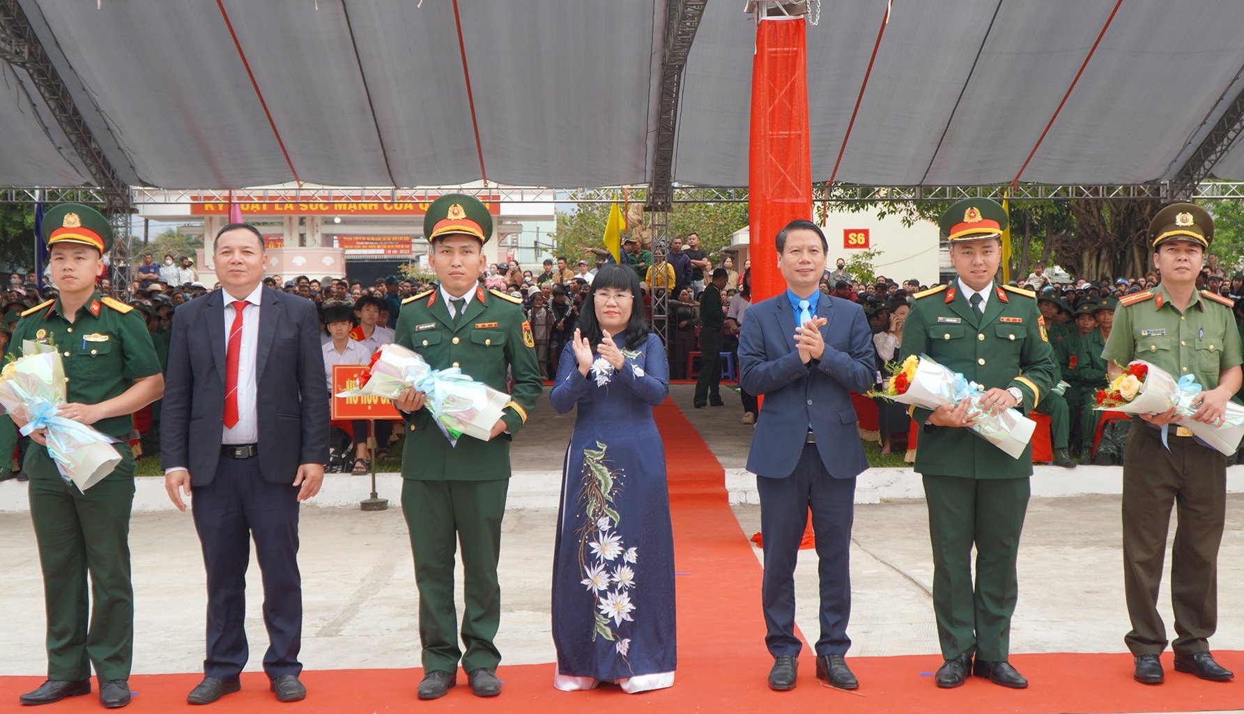 Lãnh đạo UBND tỉnh và cơ quan, ban ngành, địa phương tặng hoa các đơn vị nhận quân.