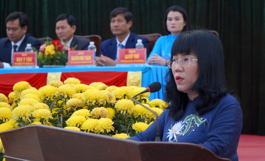 Ủy viên Ban Thường vụ Tỉnh ủy, Phó Chủ tịch Thường trực UBND tỉnh Hồ Thị Nguyên Thảo phát biểu tại lễ giao nhận quân.